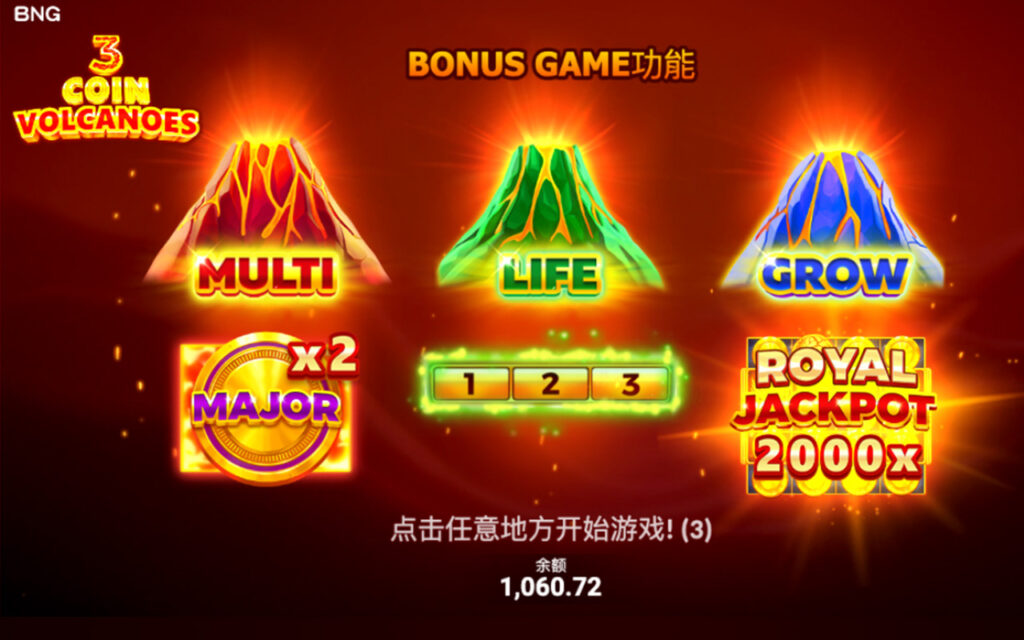 當任意有效線上出現 4 個相同符號,即可啟動紅利遊戲,進入三輪重轉 Bonus Game。在紅利期間,MULTI、GROW、LIFE 三大火山功能隨機觸發,透過倍數增幅、盤面擴展與重轉延命,持續累積 COIN 獎金 並推進 JACKPOT 進度。免費重轉次數可無上限延長,每次收集 3 個以上 Bonus 符號 即可額外獲得 +1 次重轉,讓紅利節奏持續延燒;MULTI 火山還會隨機加入 ×2~×10 倍數,疊加場上所有符號金額,最終結算時具備直衝 ×2,000 倍 JACKPOT 的爆發潛力。