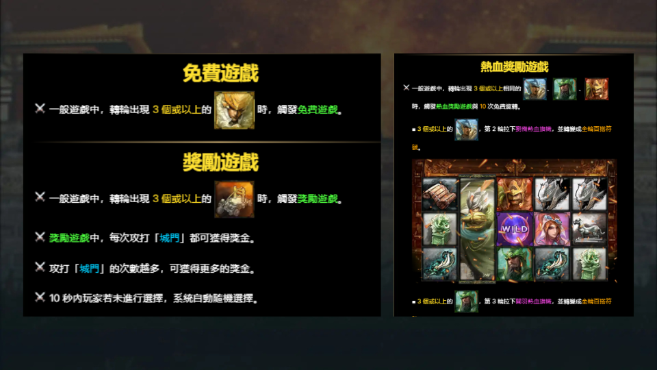 當 3 個以上「投石車」紅利符號出現,即可進入攻城獎勵模式!每次攻擊都能疊加彩金,火力越猛、獎金越高!此外,轉出 3 個以上相同「角色符號」(如關羽、張飛等),即可觸發連勝對戰模式。選擇將軍上陣,連勝越多,全盤符號將變成同角色圖案,中獎率瞬間飆升!